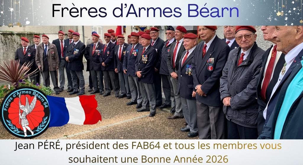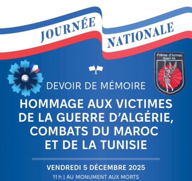 Chaque année, les membres disponibles de l’association Frères d’Armes Béarn prennent part avec respect et dignité aux cérémonies mémorielles et patriotiques. À cette occasion, ils honorent la mémoire de celles et ceux qui ont servi la Nation, notamment lors de la commémoration du 5 décembre, dédiée à l’hommage des victimes de la guerre d’Algérie ainsi que des combats menés au Maroc et en Tunisie.